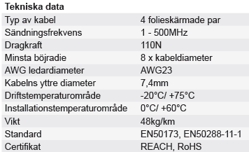Skärmad Kategori 6A U/FTP nätverkskabel (500Mhz). De fyra parens kopparledare är täckta med en folieskärm, flamskyddsmantel av LSZH, ledardiameter AWG 23. Kabeln är anpassad för inomhusinstallation och har metermarkering. Levereras i box med 305m.