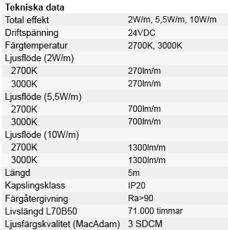 LED-strip IP20 2W/m, 5,5W/m, 10W/m i två olika färgtemperaturer 2700K, 3000K och 240LED/m. Levereras som standard i rullar på 5m med självhäftande tejp och två meter anslutningskabel i var ände. Kapningsintervall på 33mm och sammankopplingsbara med hjälp av skarvstycke E 75 116 89 alt E 75 116 90. 24V drivdon dimbara alt med on/off funktion beställes separat.