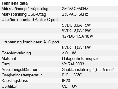 • 1-vägs vägguttag med USB typ A+C