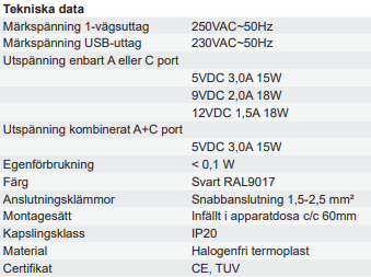 Infällt svart 1-vägs vägguttag med USB typ A+C, tillverkat i reptålig halogenfri termoplast. För laddning och strömförsörjning av enheter via USB-sladd. Autodetektering, vilket innebär att uttaget känner av tillkopplad enhet på respektive port och anpassar automatiskt laddströmmen för optimerad laddning, max 3A (totalt för båda portarna). Inbyggt överlastskydd. EMC-godkänd. Monteras i standard apparatdosa c/c 60 mm,